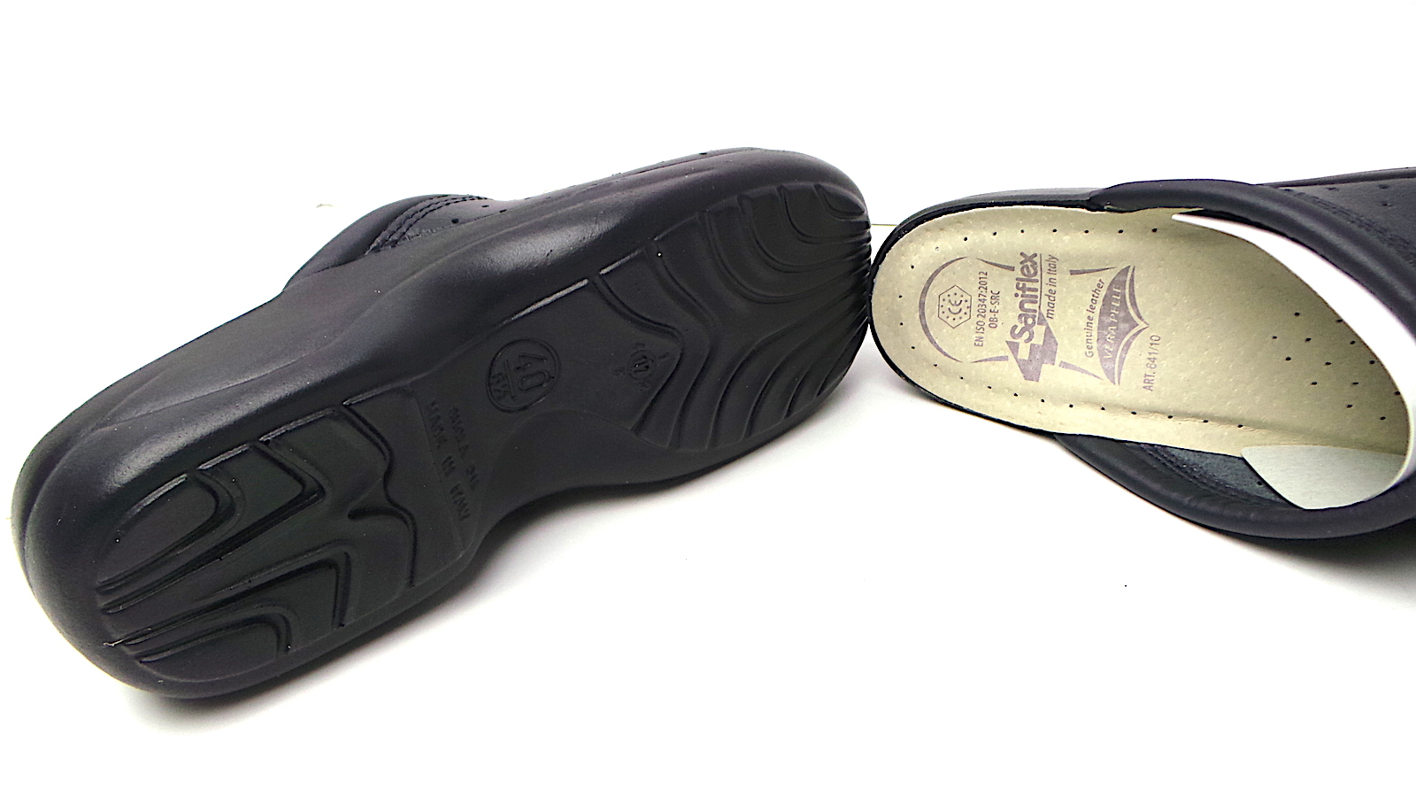 CIABATTA SANITARIA CERTIFICATA ART.641/10 COL.BLUE MADE IN ITALY . Ciabatta sanitaria certificata EN ISO 20347:2012 OB-E-SRC. Tomaia in vera pelle traforata punta chiusa. Sottopiede in vera pelle imbottito che assicura benessere al piede per un uso prolungato della calzatura. Bordino con imbottitura soffice per garantire il massimo comfort sul collo del piede. Suola anatomica in poliuretano. Prodotto interamente prodotto in Italia.